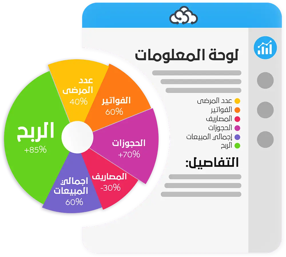 تشمل البيانات عدد المرضى، و الفواتير، و الحجوزات ، وعدد الاختبارات المكتملة والمنتظرة، والدخل، والمصاريف، والمشتريات، والأرباح. بالإضافة إلى ذلك، تعرض الإحصائيات أكثر الاختبارات والإحالات والتعاقدات تحقيقًا للدخل للمختبر.