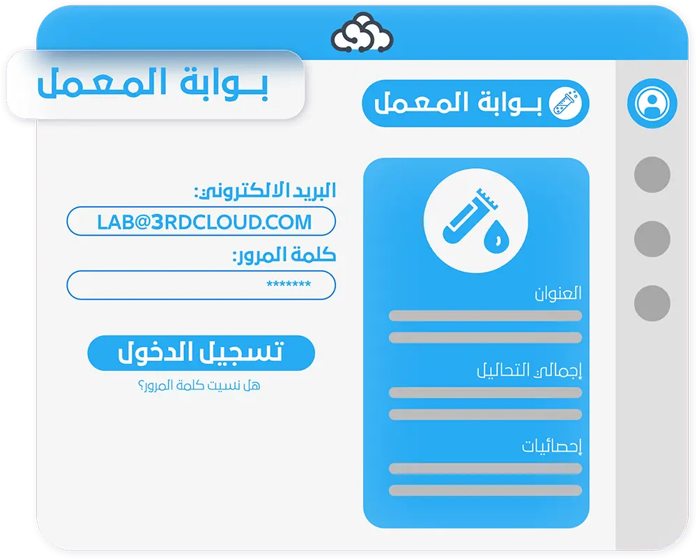 بوابة متكاملة للمختبرات الخارجية حيث يتم تسجيل الدخول من خلال البريد إلكترونى و كلمة مرور الذين يتم تعيينهم من خلال بوابة الإدارة و تحديد صلاحيات معينة لكل مختبرحيث تمكنهم البوابة من إضافة بيانات و طلبات المرضى الخاصة بهم و طباعة النتائج الطبية للإختبارات عند الإنتهاء من العمل على العينات و أيضا إستخراج تقرير حسابي بتفاصيل الفواتير و المدفوع منها و المبالغ المتبقية عليهم .