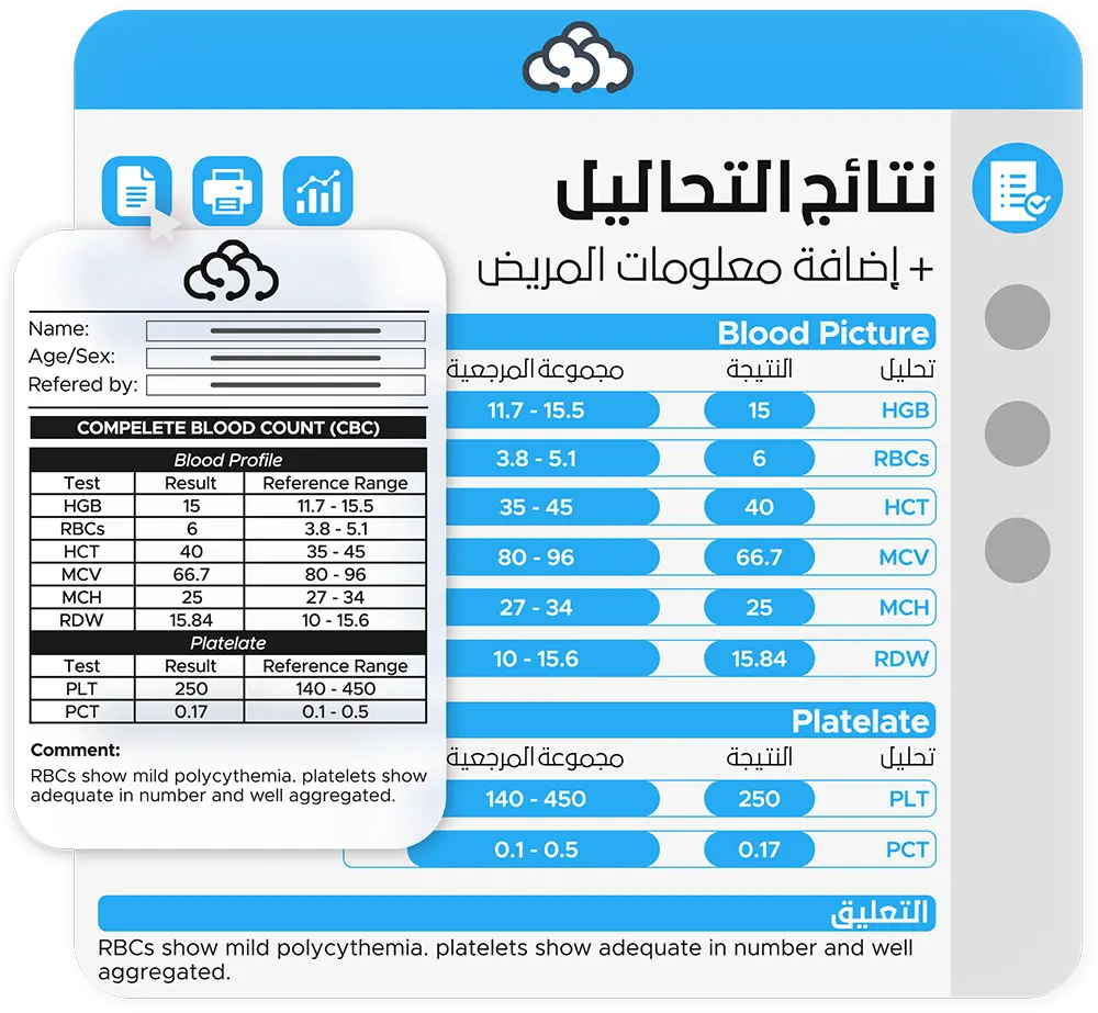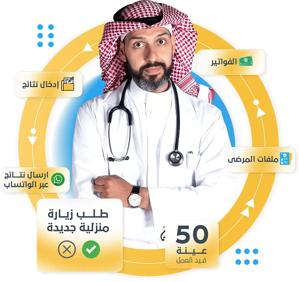 إدخال نتائج الإختبارات و المزارع و مراجعة و تأكيد النتائج و طباعتها و إرسالها للمرضى من خلال الواتس آب أو البريد الإلكتروني أو الرسائل النصية القصيرة