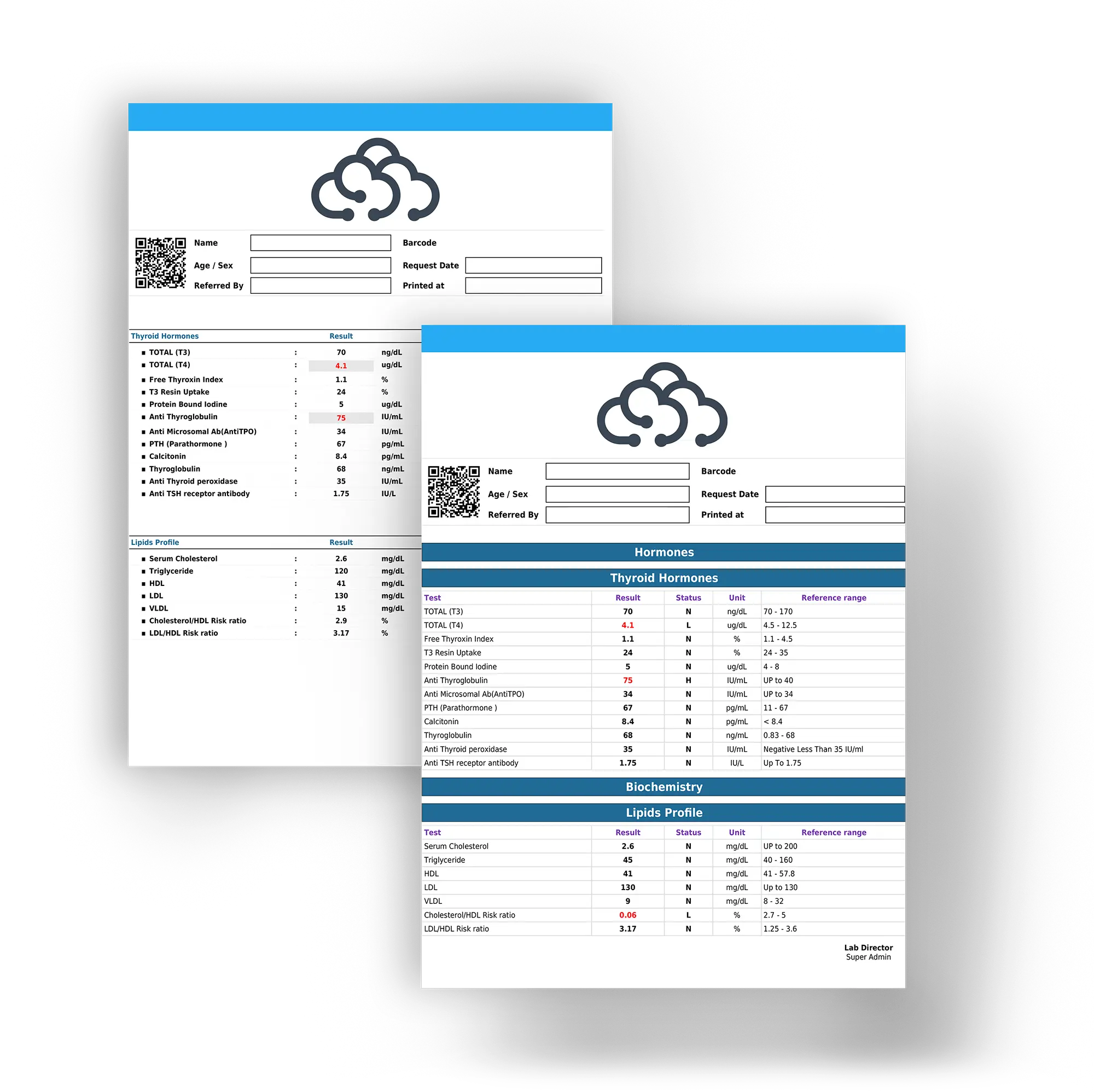 يوفر النظام مجموعة متنوعة من أشكال التقرير الطبي التى يمكن الإختيار منها ما يناسب المختبر مع إمكانية التخصيص و التعديل عليها بشكل مرن عن طريق إظهار و إخفاء بعض المعلومات و تعديل اللون و نوع الخط و حجم الخط و إضافة رأس للصفحة و زيل و علامة مائية على هيئة صور يتم إضافتها .