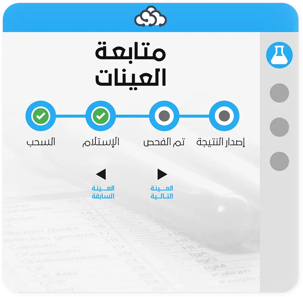 متابعة حالات العينات من خلال الباركود المطبوع لكل عينة و تحديد حالة العينة و تاريخ تغيير الحالة و الموظف الذى قام بتغييرها من سحب أو إستلام أو رفض مع تحديد السبب للرفض و إمكانية إعادة سحب العينة .