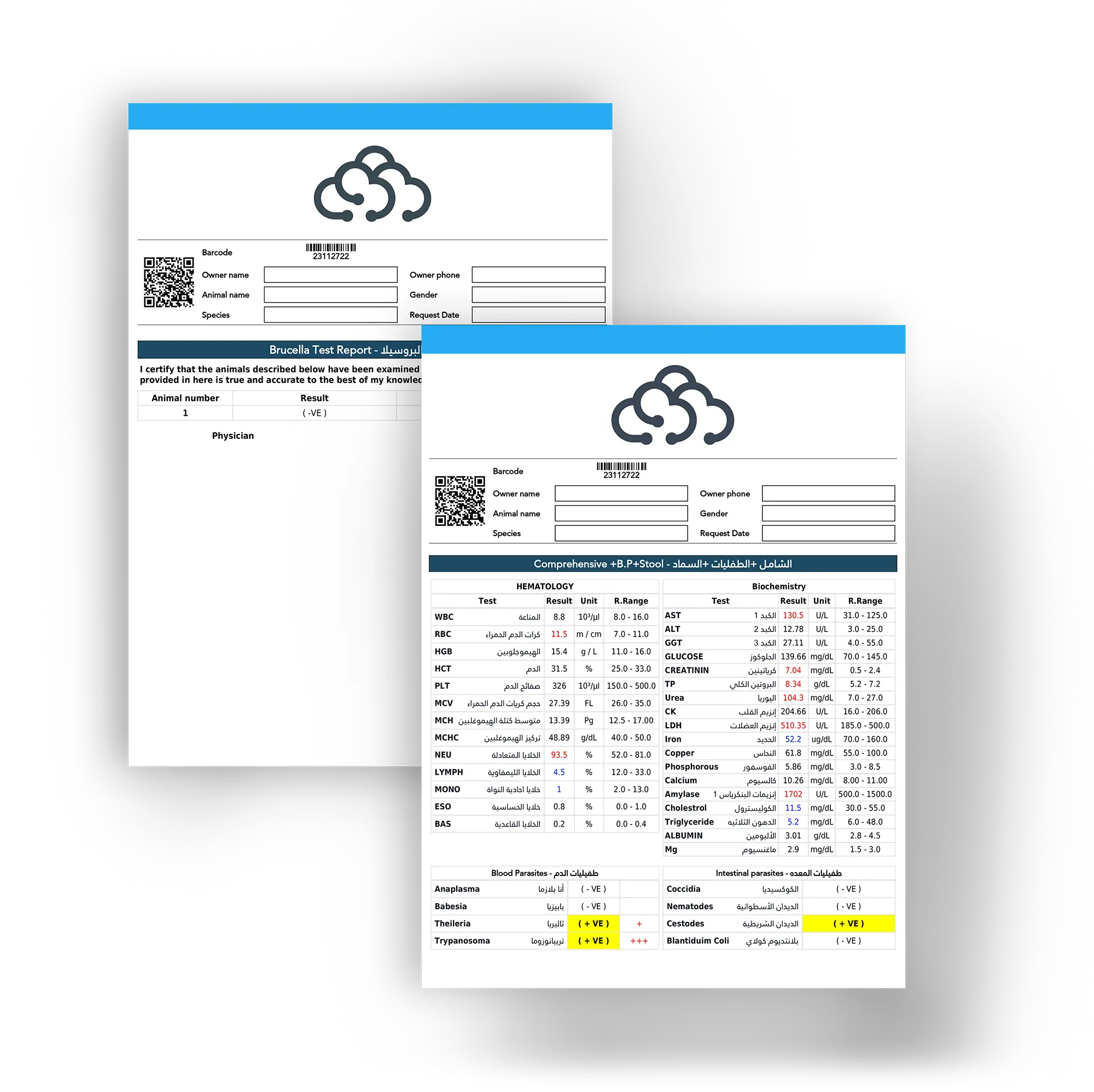 يحتوي النظام على العديد من الفحوصات البيطرية مثل: فحص الدم، وفحص الكيمياء، وفحص الطفيليات الدموية والمعوية، وفحص المالطية، وفحص المالطية الإليزا، وفحص البول. كما يوفر النظام إمكانية تعديل الوحدات الطبية والقيم المرجعية لكل حيوان وأسماء الفحوصات باللغة العربية وإضافة فحوصات اخري.